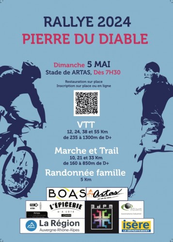 Le rallye VTT, trail et marche de la Pierre du Diable, organisé par le Sou des Ecoles d’ARTAS, est un évènement majeur qui se déroulera le dimanche 5 mai 2024.